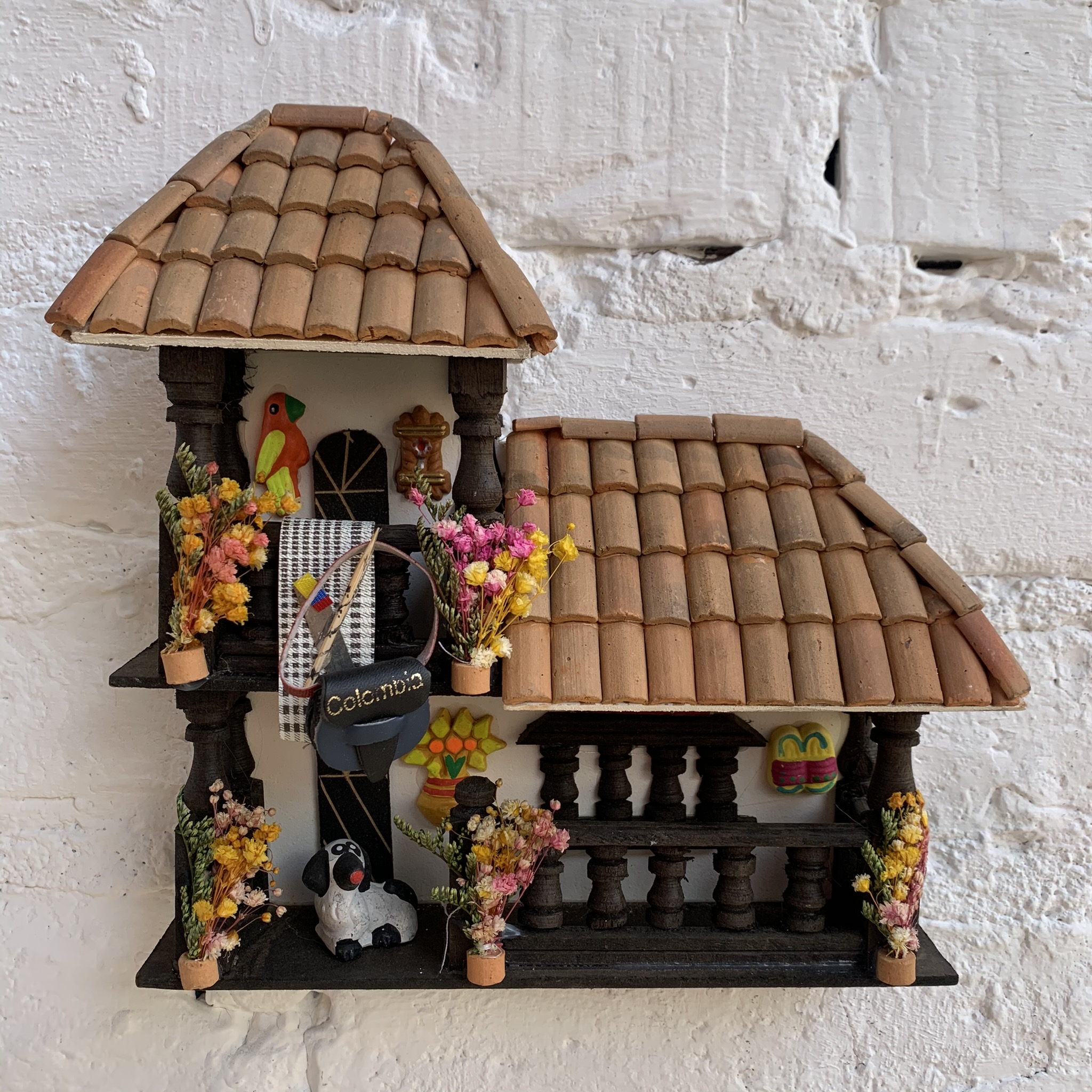 Balcón de dos niveles pequeño elaborado artesanalmente en madera con pequeñas figuritas en cerámica y tejas en arcilla, ideal para utilizar como decoración.